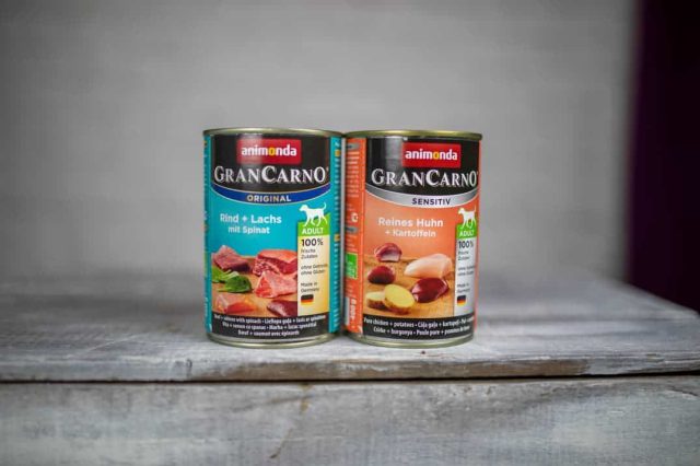 Für unseren großen Hundefuttertest haben wir uns jeweils drei 400g-Dosen der Sorten GranCarno Original Rind + Lachs mit Spinat und GranCarno Sensitive Reines Huhn + Kartoffeln gekauft. Beide Sorten sind als Alleinfuttermittel für erwachsende Hunde ausgezeichnet. Du kannst beide Sorten auch in 800 Gramm Dosen und in verschiedenen Sparpaketen kaufen.